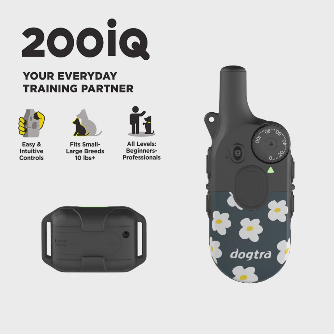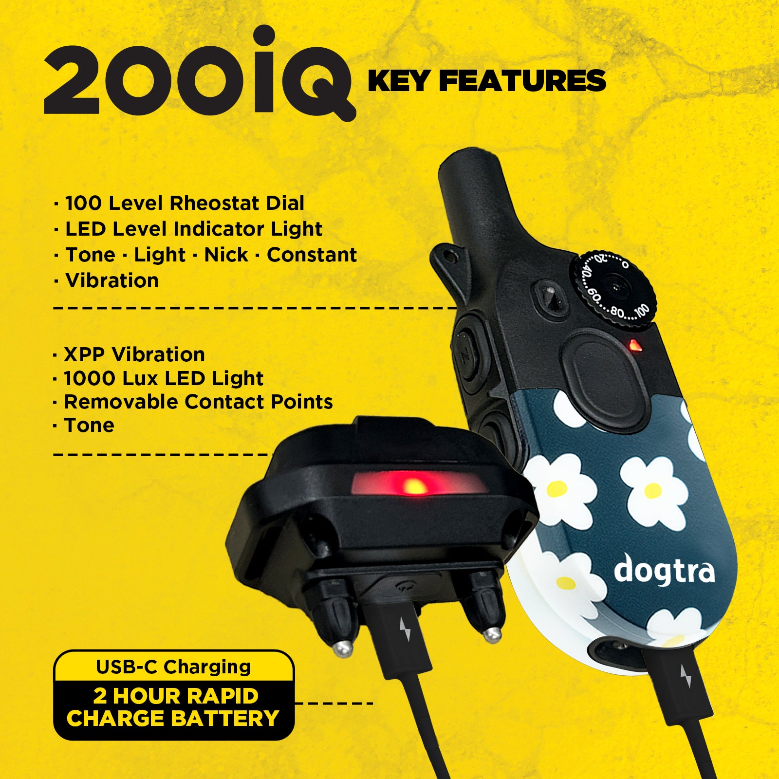 200iQ 1-DOG UNIT- Meet your everyday training partner. The 200iQ e-collar makes dog training simple and stress-free. Easy-to-hold and control remote with 100 levels, tone, and vibration creates clear communication with your dog. Remove contacts for vibration-only training. Waterproof design handles daily walks to weekend adventures. Compact and lightweight versatile for small, medium and large breed dogs.