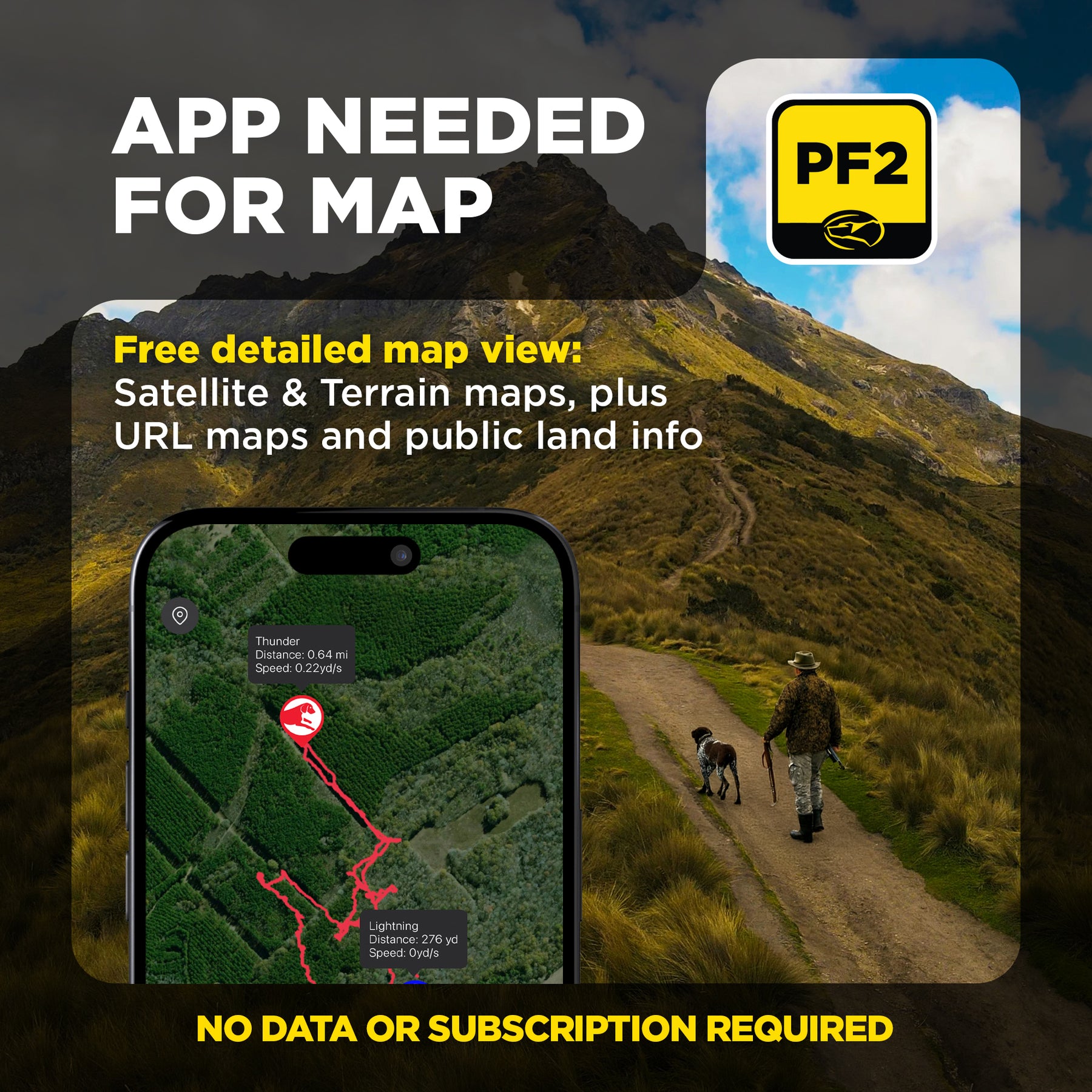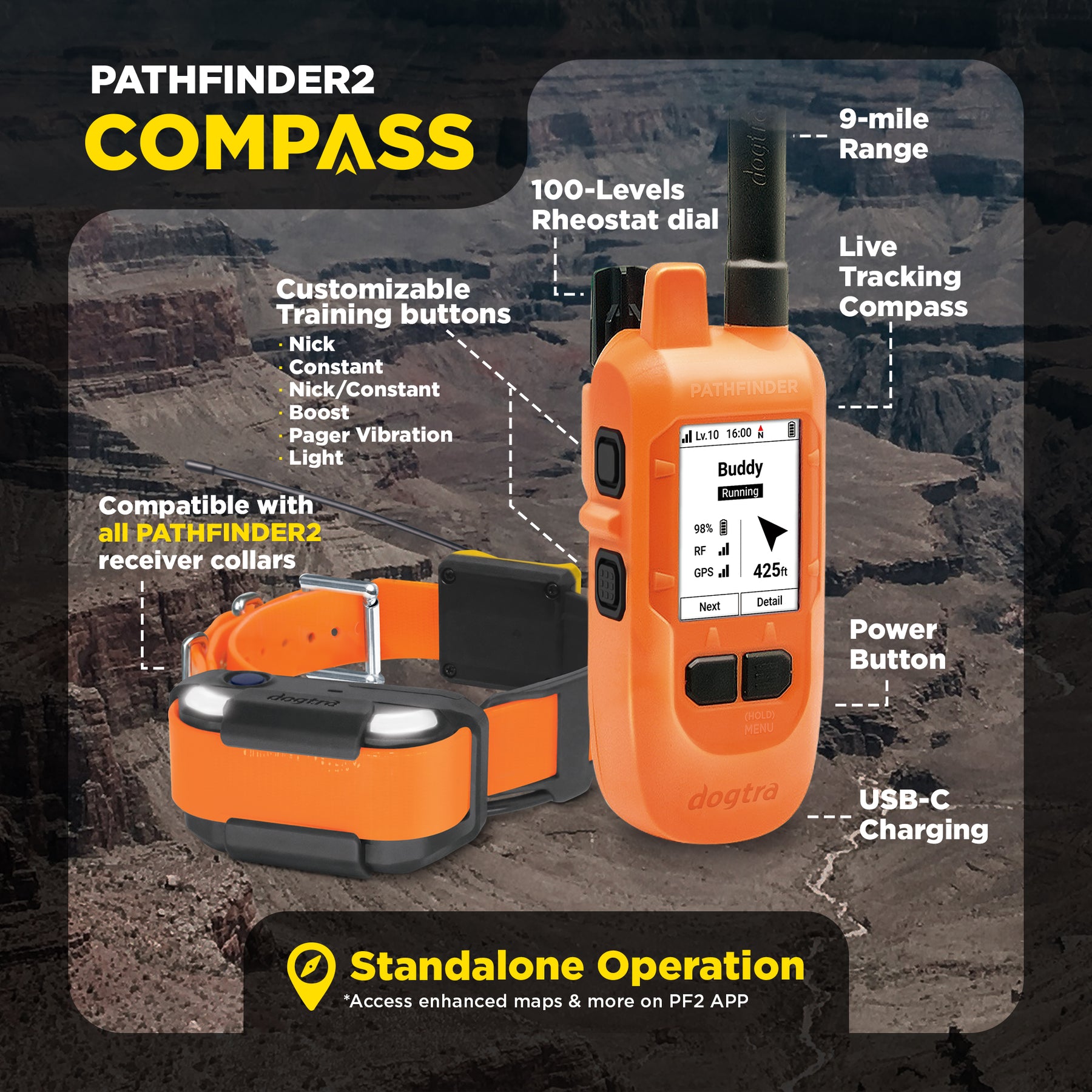 The PATHFINDER2 Compass Handheld shows live direction and distance to your dogs. Customize the buttons to toggle between dogs or assign each to one dog. Works independently with no subscription required.
